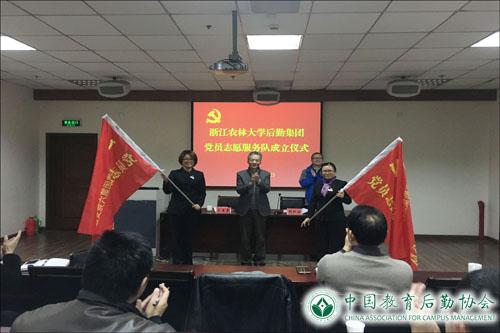 成立仪式上,王自勇同志为“后勤集团党员志愿服务队”、“第二党支部党员志愿服务小分队”、“第六党支部党员志愿服务小分队”授旗。集团党总支书记钱杭园同志宣读了《关于组建浙江农林大学后勤集团党员志愿服务队的通知》。