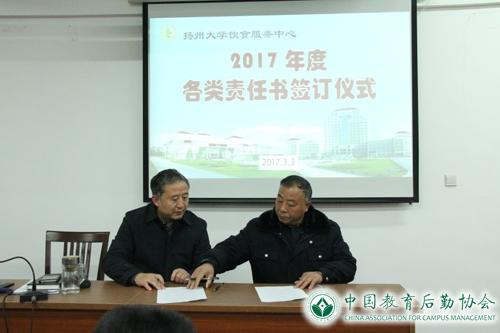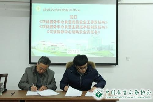 大会开始,饮食中心主要分责人分别与3名分管校区主任签订《饮食服务中心校园安全综合管理责任书》,7名部门负责人签订《部门安全工作责任书》,23名食堂经理签订《饮食服务中心食堂食品安全工作责任书》、《饮食服务中心2017度食堂主要成本控制责任书》、《饮食服务中心消防安全责任书》。督查部主任与6名食品安全专职督察员签订《饮食服务中心专职食品安全督察员责任书》,核算部主任与13名保管核算员签订《饮食服务中心食堂保管核算员安全责任书》。