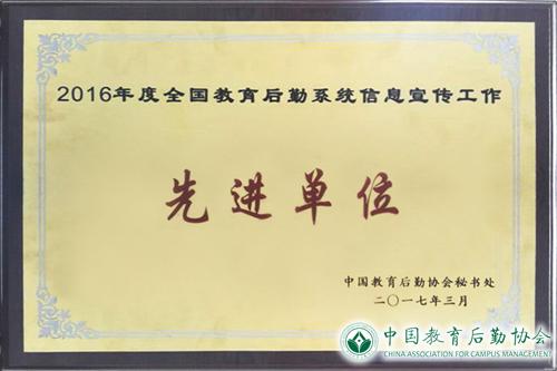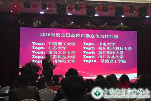 会议对2016年度全国教育后勤系统信息宣传工作先进单位进行了表彰,并发布了2016年度全国高校后勤宣传力排行榜、2016年度全国高校后勤研究力排行榜。在中国教育后勤协会首次评选发布的全国高校后勤宣传力排行榜、全国高校后勤研究力排行榜中我校分别名列第七、第八,并被授予“2016年全国教育后勤系统信息宣传工作先进单位”荣誉称号。