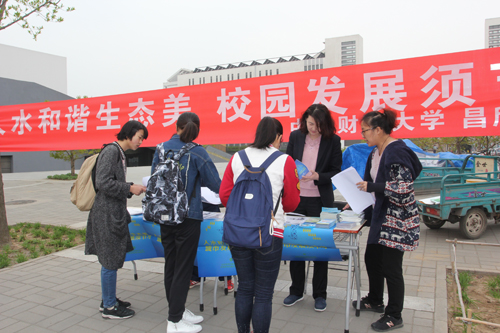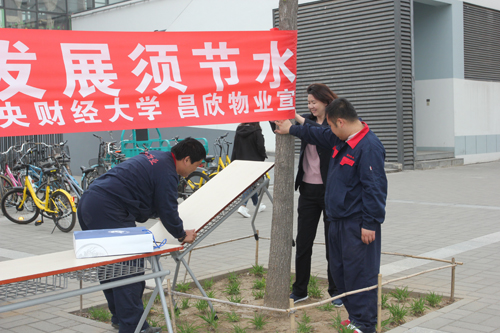 活动当天,昌欣物业工作人员提前到达活动场所,悬挂横幅,摆放桌椅和宣传资料,随后与4名学生志愿者一起向在校师生发放由北京市节约用水办公室编制的节水常识宣传册、宣传页,中央财经大学后勤服务产业集团编制的《节能减排倡议书》等宣传资料,倡导节约用水,树立“节水为荣,浪费为耻”的观念,促进大学生建立节水理念,养成良好的用水习惯。