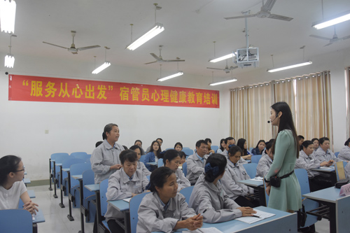 4月15日下午,广西交通职业技术学院后勤保卫处2017年度优质服务系列活动之 “服务从心出发”宿管员心理健康教育培训暨宿管活动月启动仪式在A216教室举行,此次培训由学生工作处心理咨询室关文莉老师主讲,李锦副处长、宿舍管理干事以及宿管员参加培训。