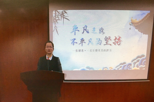 微型党课由后勤党委委员方芳同志主讲。她从饮食服务中心第五餐厅主任张继惠用意见本赢得师生好评的故事引入,以小见大,用真挚的情感、生动的语言,讲述了后勤员工在最平凡岗位上诚信、友善、沟通的工作态度,展现了后勤党员敢于担当的精神。