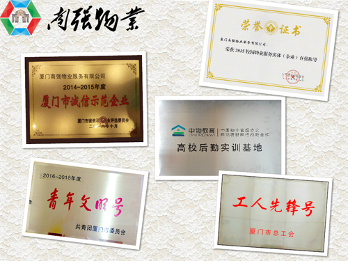 公司所承办的管理服务项目,日渐得到广大业主、客户的认可,得到社会肯定,公司被中国高等教育后勤协会物业管理专业委员会授予“中国校园物业服务实体(企业)百强”企业五十强、“中国高校物业管理工作先进集体”,被中物教育授予“高校后勤实训基地”,被厦门市授予“工人先锋号”、“青年文明号”、“诚信示范企业”,被厦门大学离退休工作部(处)授予“敬老助老服务先进集体”,厦门市思明区白城居民委员会授予“敬老助老服务先进单位”等荣誉称号。