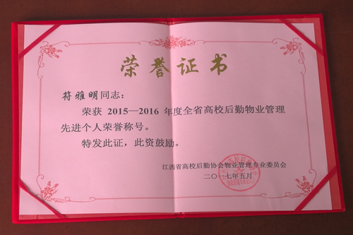 2016年后勤在物业园林管理方面,多次到兄弟院校学习,并请明德物业专家围绕“如何成为优秀员工”、“物业服务安全意识”、“物业实操”等主题对后勤员工进行培训,加强管理,逐步对室内保洁、门卫值守等物业管理工作进行规范化,在精细化、标准化、专业化方面取得良好成效。其中涌现了一批对学生公寓的管理尽职尽责,关心学生、爱护学生、服务学生,精心指导学生创建自己的温馨之家的物业人员。章秀英、符雅明荣获2015-2016年度全省高校后勤物业管理先进个人荣誉称号。