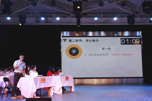 首先,在主持人的引导下,10支参赛队伍逐一进行了风采展示,有趣的队名、响亮的口号,表达了他们必胜的决心。此次竞赛的主要形式为现场竞答,分为“有问必答”、“齐心协力”、“志在必得”和“绝地逆转”四个环节。在“有问必答”环节,各队均展示了自己的实力,指定题目、指定选手的比赛方式并没有将分数拉开太大差距。“齐心协力”环节要求三位选手通力合作,完成难度较高的问答题作答,有的队伍表现镇定、胸有成竹,有的队伍抓耳挠腮、凝思苦想,江宁清真餐厅抽到的题目较难,选手们最终未能达到得分点,与该轮成绩失之交臂,但她们积极坚持到答题时限的比赛精神,获得了现场观众的热烈掌声。本轮比赛结束后,分数逐渐拉开,本部二食堂、和园餐厅代表队暂时获得领先。接着,紧张激烈的抢答题环节开始了,本环节考验选手们快、狠、准的抢答手法,选手们为了抢到题目的回答权都拼尽了全力,各队竞争激烈,观众鼓掌声不断,赛场气氛热情高涨。机关代表队在本轮如鱼得水,三位美女选手机智果敢,兼具速度与准确率,不断赶超对手,获得了比赛的绝对优势。“志在必得”环节之后,比赛的关键环节——“绝地逆转”开始了,该环节为风险抢答题,不仅考验选手娴熟的抢答手法,还对答题准确率有着较高要求,由于选手在之前环节中的出色表现,该轮环节实际是机关代表队、和园餐厅代表队、本部二食堂代表队,三只代表队之间的较量,随着机关选手们的抢眼表现,最终以200分的比分脱颖而出,获得了此次比赛的冠军,本部二食堂、和园餐厅代表队获得了亚军。比赛又随之进行了加时赛,3支三等奖获奖队伍、4支参与奖获奖队伍,随着比赛成绩出炉。
