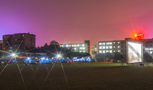 夜幕下,体育场上星星点点搭起二十多顶帐篷,同学们真切体验了户外露营的感觉,在星空下,在帐篷中观看露天电影《鸟瞰中国》和《美食、祈祷和恋爱》。随着月夜渐深,一天快乐的校园之旅落下帷幕。