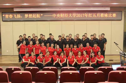 5月31日下午14:00,由中央财经大学校工会主办的以“青春飞扬,梦想起航”为主题的红五月歌咏比赛活动在沙河校区图书馆地下报告厅隆重举行。比赛由校工会副主席顾文佳主持,校工会兼职副主席郑朝阳、吕杰和我校艺术专业教师刘震、李彦君、谭嗣钰以及校工会老师担任了此次比赛的评委和统计服务工作。校党委副书记兼校工会主席陈明、校党委副书记梁勇、校工会常务副主席刘晓勤、昌欣物业副总经理韩耕宸等领导出席本次活动,与现场职工代表共同观看了比赛。
