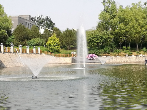 为此,学校后勤基建处经多方实地考察调研,决定给人工湖安装上“人工心脏”和“呼吸通道”,在湖中心安装三台浮水喷泉式曝气机,对水体进行循环强化复氧处理,提高水体的自净能力,抑制湖中有害生物的生长,保证校区内生态系统平衡。同时,三台曝气机还会定时启动喷泉,提高湖水的观赏效果,使湖水、喷泉与周围的绿化景观交相辉映,为学校广大师生营造一个绿树掩映、清新优雅的校园环境。