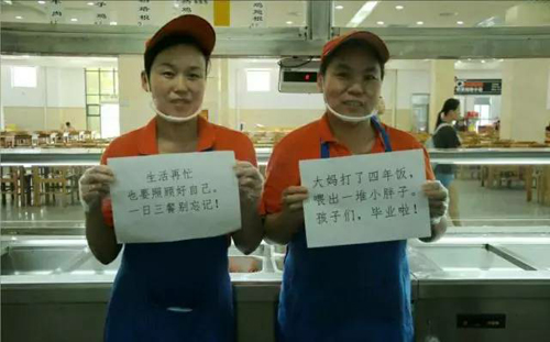 “大妈打了四年饭,喂出一堆小胖子。孩子们,毕业啦!”