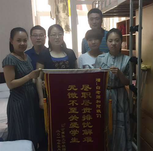 张同学因遭遇车祸行动不便,宿管老师知道后,立即安排其入住进我校刚刚筹建好的“爱心宿舍”,学院也安排同学随同陪护对其照顾。该生入住一个多月来,宿管老师、保洁阿姨关系非常关心其饮食起居,公寓科的老师们也多次到宿舍对她进行慰问。在大家的共同照顾下,积极投入到毕业前的准备之中。目前,该生已顺利通过答辩,在即将毕业之际,她向宿管老师和阿姨们赠送锦旗以表达自己的谢意。