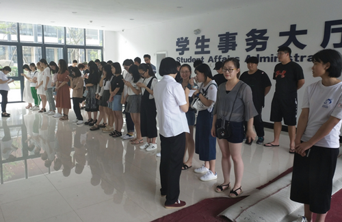 考核现场,40名学生按性别要求站为两排,每排20人。每位学生编有号码,要求值班员从中辨认出入住所在楼栋的10名学生,并写出学生姓名、所在的寝室号、专业和带班辅导员。经考核,来自5号公寓楼的罗崇芝阿姨以99高分成为本次考核的第一名。