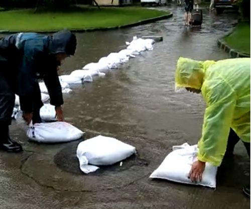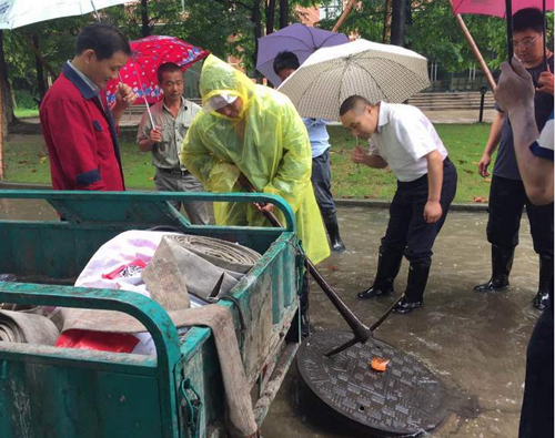 24日清早,公司总经理王文虎带领物业服务中心一行9人冒雨查看下沙校区、东校区及研究生公寓楼的主要道路环境面貌和地下室雨水管道情况,并提出相应的防汛方案和整改措施和。因雨量太大,校园里地处低洼的部位还是出现了不少积水,积水最为严重的是校区十一教北侧道路,积水深达20CM左。王总带领大家对此处积水情况进行分析,并查找出积水原因是由于校外河道排水口不畅导致。中心小组成员立即在道路中间堆放沙包,为学生开辟一条“安全通道”。在其它积水区域也进行抽水处理,特别是生活区1#变电所电缆井进水严重,设备维保人员集中精力对此进行排水,保证设备设施的安全。