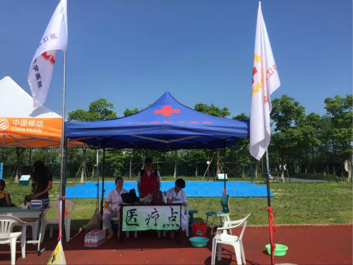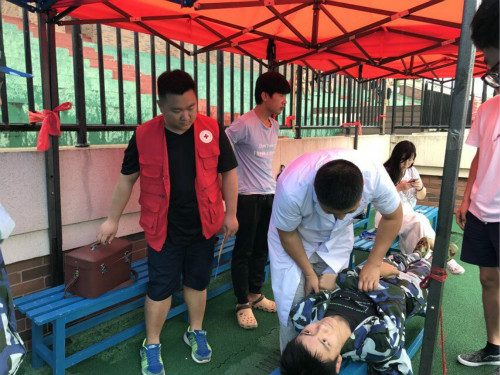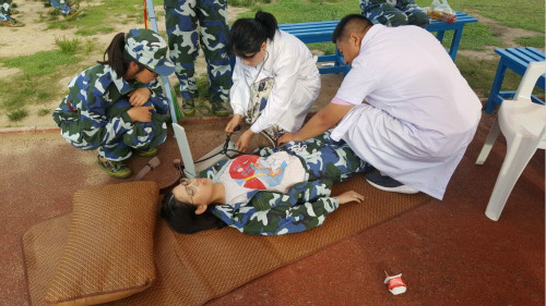 校医院在军训场地设立了3个医疗点,每天安排2位医护人员,35度的高温下,他们在医疗点与军训方阵中穿梭。有中暑的学生倒下了,他们冲上去救助,顾不上擦一下头上的汗;有晕倒的同学磕破了膝盖,他们冲上去处理,顾不上多喝一口水……有这群可爱可敬的“白大褂”的守护,学生们军训更加安心了。除了提供现场医疗救助以外,校医院医护人员也会在每天训练前后观察参训学生的健康状况,确保学生健康参训,平安结训。每天,他们都是第一个来到军训场地的人,也是最后一个离开场地的身影。此外,校红十字会志愿者也积极加入到医疗队的服务中来,每天2-3名志愿者轮流值班。截止到7月5日为止,校医院医护人员累计值班人数14人次,服务42小时,处理伤员243人次。
