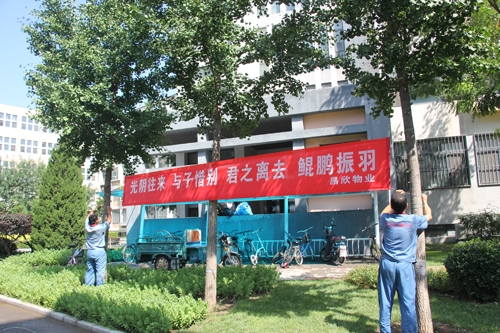 公司撰写并制作四个条幅于7月7日分别悬挂于西区道路北侧、东区11号楼东侧逃生门对面、龙马路北和东区9号楼车棚前,寄情于思,表达对“离家”学生的不舍之情。