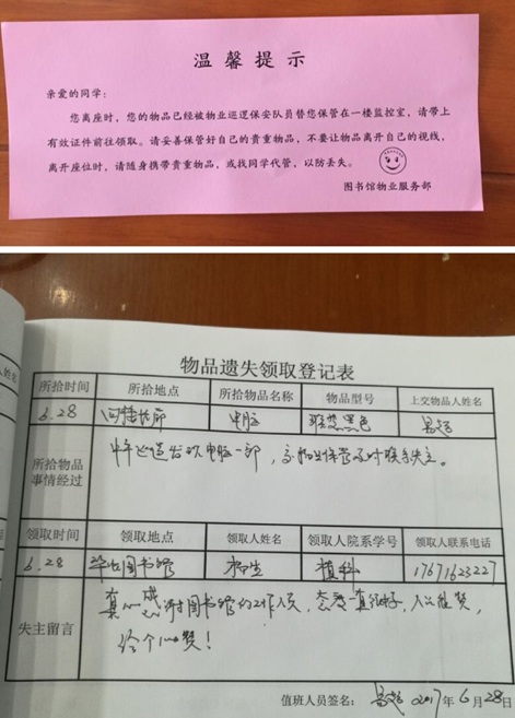 6月28日,植物科学技术学院的杨同学在图书馆一楼监控室拿到了自己在图书馆自习长廊留下的笔记本电脑,怀着感激的心情他在物品遗失领取登记表上留言到“一定要给图书馆物业的服务一百个赞”!