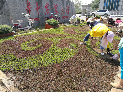 据统计,校园共有花坛5个,创意花境5个,移动花箱35个。新生报到之前,这些位置的花卉需全部换新,而这些工作只有花卉租售部三名管理员、两名师傅和其他部门的协助下一起完成,任务量之大可想而知。其中西大门的花坛,从图案创意到植物素材都由该部门员工完成,由于今年暑假期间,武汉高温极端天气持续近10天,繁殖的红绿草部分受损,经过他们的努力,采取降温防暑措施,发现后立即补充繁殖,才确保了花坛图案素材(红绿草)的充足,一片祥云才能及时的展现在西大门口。“每天五点就要起床,和工人师傅一起到校园各处栽花,这个过程真的很累,人都很疲倦,但是,当看到老师、同学们指着我们的作品说好看,并和这些美景合影留念时,觉得自己做的一切都是值得。”管理员宋莹莹如是说。