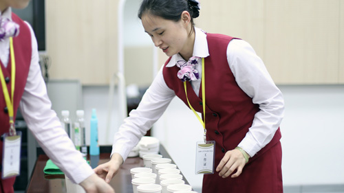 客服主管杨伟在贵宾休息室准备糕点
