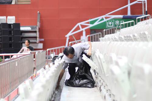 来自集团楼宇中心项目和独墅湖体育中心项目的工作人员,在集团东吴物业副总经理戚海娟和城区物业三分部经理袁大为的带领下,首先将高招会的现场清理完毕,然后开始紧锣密鼓地进行学位授予仪式的会场布置。大到主礼教授休息室、主席台,小到休息室的茶点、会场内的饮料瓶,任何一个细节都力争做到尽善尽美。