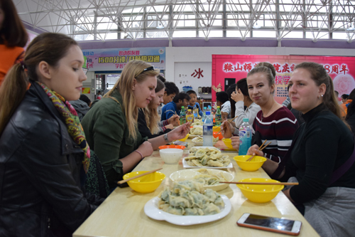 终于,十一点,在大家的不懈努力下,饺子宴正式开始。一碗碗热气腾腾的饺子在期待中被端上了餐桌,各分院的同学在已经分好的地方坐下一起欢喜地品尝了“胜利果实”,学生们自发表演的节目也隆重登场,准备表演节目的中外学生在音响师旁边排起了长队。