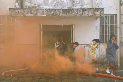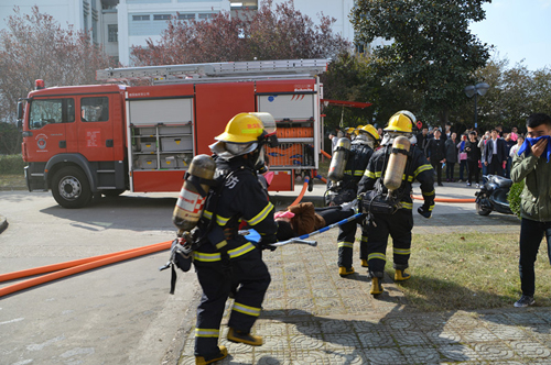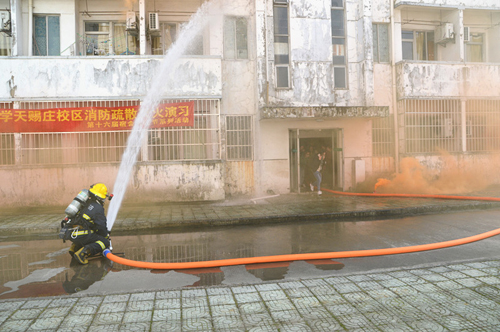 演习中,值班人员反应迅速,在5分钟内完成了全宿舍楼近500名学生的疏散演练