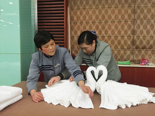 该活动设置了“铺床单比赛”、“叠标准浴巾(包括叠浴巾天鹅)以及浴巾创意叠法”、“现场教学”等环节。前两个环节分别采用小组对抗赛形式:由8名客房服务员两两分组,进行铺床单和叠标准浴巾比赛。最后评选出成绩优异的服务员成为此次比赛的优胜者。最后一个环节则是由客房人员现场教授留学生如何铺床单以及如何叠可爱的毛巾小狗,此次比赛吸引了众多留学生公寓员工以及留学生的参与。