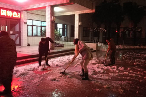 2018年1月4日,扬城迎来了新年第一场雪,扬州气象台升级暴雪黄色预警信号为暴雪橙色预警信号。雪情就是命令,5日一大早,后勤保障处在洪涛副校长的领导下迅速行动,动员全体后勤职工扫雪铲冰。
