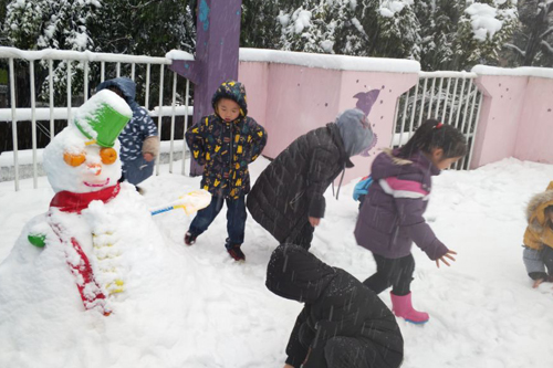 接到上级通知,幼儿园积极响应,在告知家长的同时,也考虑到学生家长的困难,延长孩子在园时间,于停课两日期间安排值班老师守园,开设校内职工子女照顾班。此举不仅解决了家长的后顾之忧,亦得到家长们的一致称赞。值班老师带领孩子们做游戏、打雪仗、堆雪人,别提多开心了!