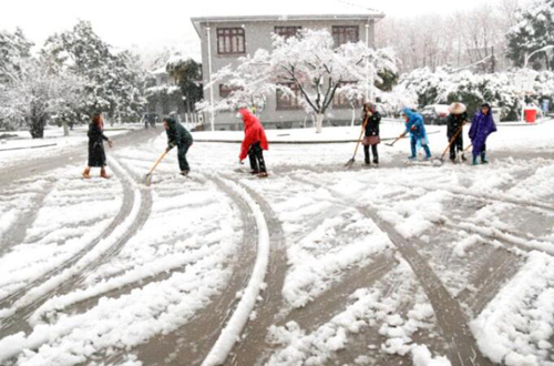 道路清障组充分发挥“不怕苦、不怕累”的物业精神,用铁锹等工具清除路面厚厚的积雪。7点零5分左右,学生公寓至学生食堂至教室等处全线贯通,8点前,学校主干道交通恢复,由于预案有效,处置得当,确保了学校正常的教学和生活秩序。绿化和机动组继续发扬“老园林精神”,在校区主任带领下,冒着严寒,仔细排除安全隐患:一是迅速转移路面断枝,恢复道路通行;二是用预先准备好的竹竿敲打树干、树枝和树叶上的积雪,恢复树形,尽量减少损失;三是将已倒伏的树木进行清理,以便树木的整形恢复。楼宇维护组发扬“老黄牛精神”,在教学和办公场所前的台阶上铺上防滑垫、安排工作人员列岗提醒进出楼宇的师生注意安全、全面恢复楼宇周边秩序。尽管许多同志衣服湿透,鞋子进水,却全然不顾,心中只有一个念头,为确保师生能够坐进温暖的教室按时开课。