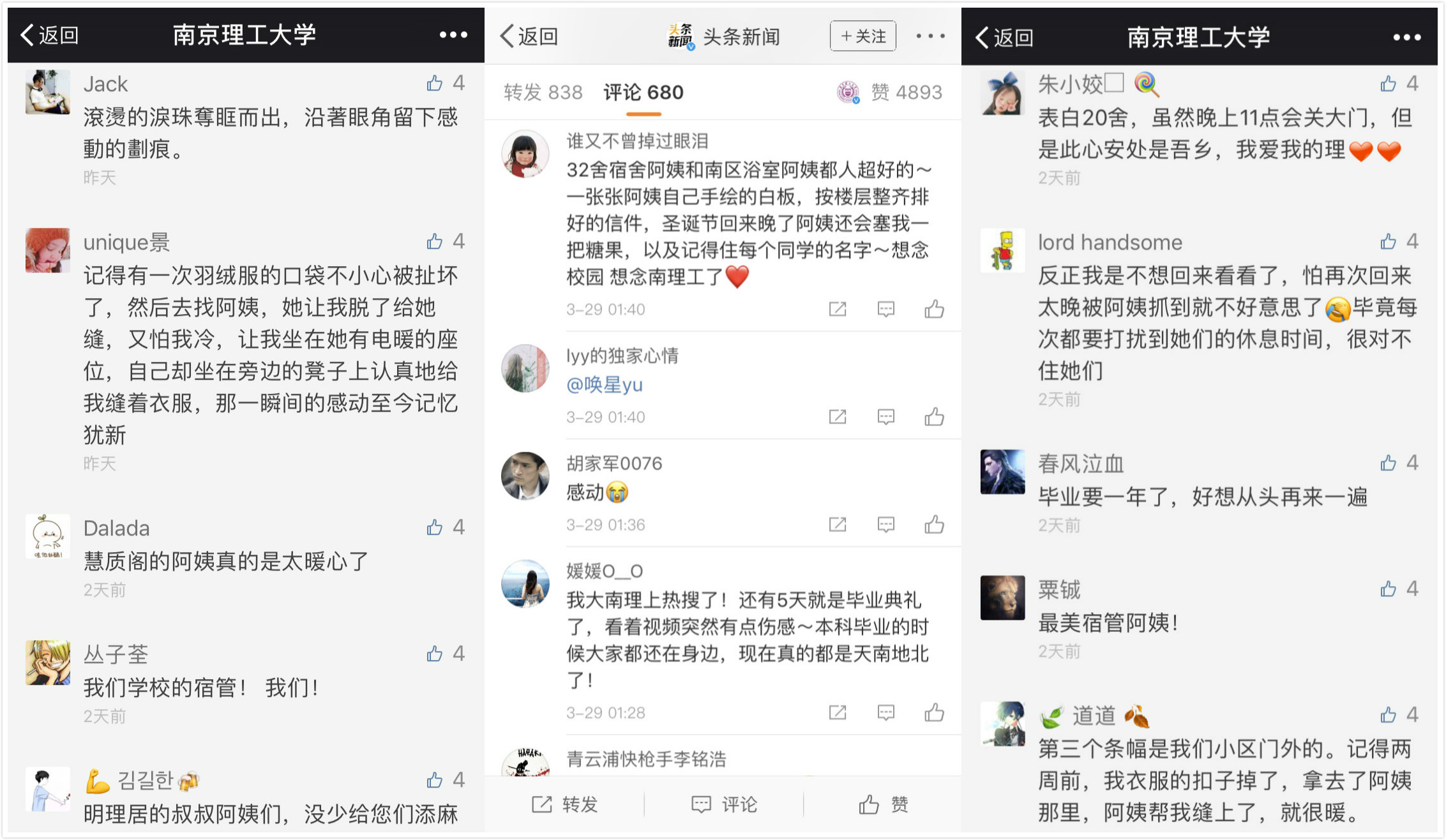 3月27日下午16时左右,金陵晚报推送了一则微博,名为“飙泪!大学惊现毕业横幅:以后再没有23点关门,但你要记得早点回家!”该则推送以视频的形式展现了学生公寓宿管阿姨为毕业生们写下的临别祝福横幅,以及为学子们在白板上写下的句句叮咛。视频一经发布,迅速引发网友热烈转载和评论,央视新闻移动网当日下午便转发了该条视频。3月28日起,该条视频先后被中国新闻网、新华社、人民日报、光明日报、央视网、头条新闻、南京日报、金陵晚报、南京文明网、温州都市报、河南交通广播、以及新浪视频、腾讯视频等多家媒体陆续转载;3月28日晚,因为该则视频,南理工登上微博热搜榜第三名;3月29日,南京十八频道特别对我校学生公寓工作人员进行了采访,《标点》栏目播出专题报道。学生公寓在今年为毕业生们准备的暖心横幅,以简短而深情的文字,戳中广大学子和网友的内心,在网上掀起一阵追忆青春、追忆大学时光的热潮。截至目前,据不完全统计,除去众多网友的自发转载,“以后再也没有23点关门”的视频和相关报道在各大主流媒体和客户端的浏览量已超过350万人次。