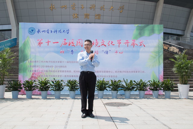 教辅机构党委书记、后勤服务与管理中心李虎处长为本届环境文化节致开幕词,他指出我校历来非常重视校园环境建设,多次被评为环境示范校园,优雅的校园环境和校园文化对学生的成长与发展起着陶冶情操、砥砺德行、磨炼意志的作用。希望通过环境文化节这个平台,鼓励同学参与到环保事业中来,将环保理念惠及校园中的每个人。校党委书记王兴杰宣布杭州电子科技大学第十一届校园环境文化节开幕。