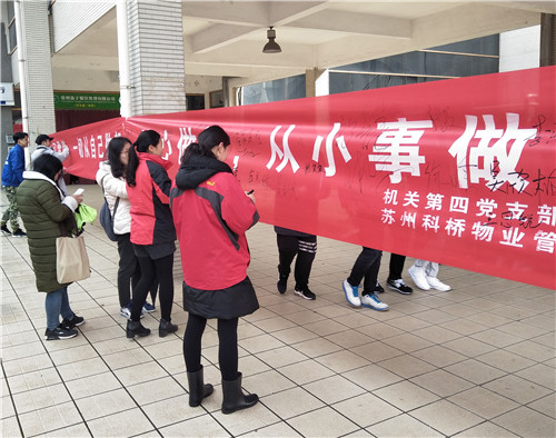3月5日,苏理工机关第四党支部与科桥物业苏理工项目部在学生第一食堂门口开展“学雷锋”系列活动。活动内容主要包括以“学习雷锋,从自己做起、从心做起,从小事做起”为主题的签名活动、免费测量血压血糖、衣物缝补及清扫校内白色垃圾等。