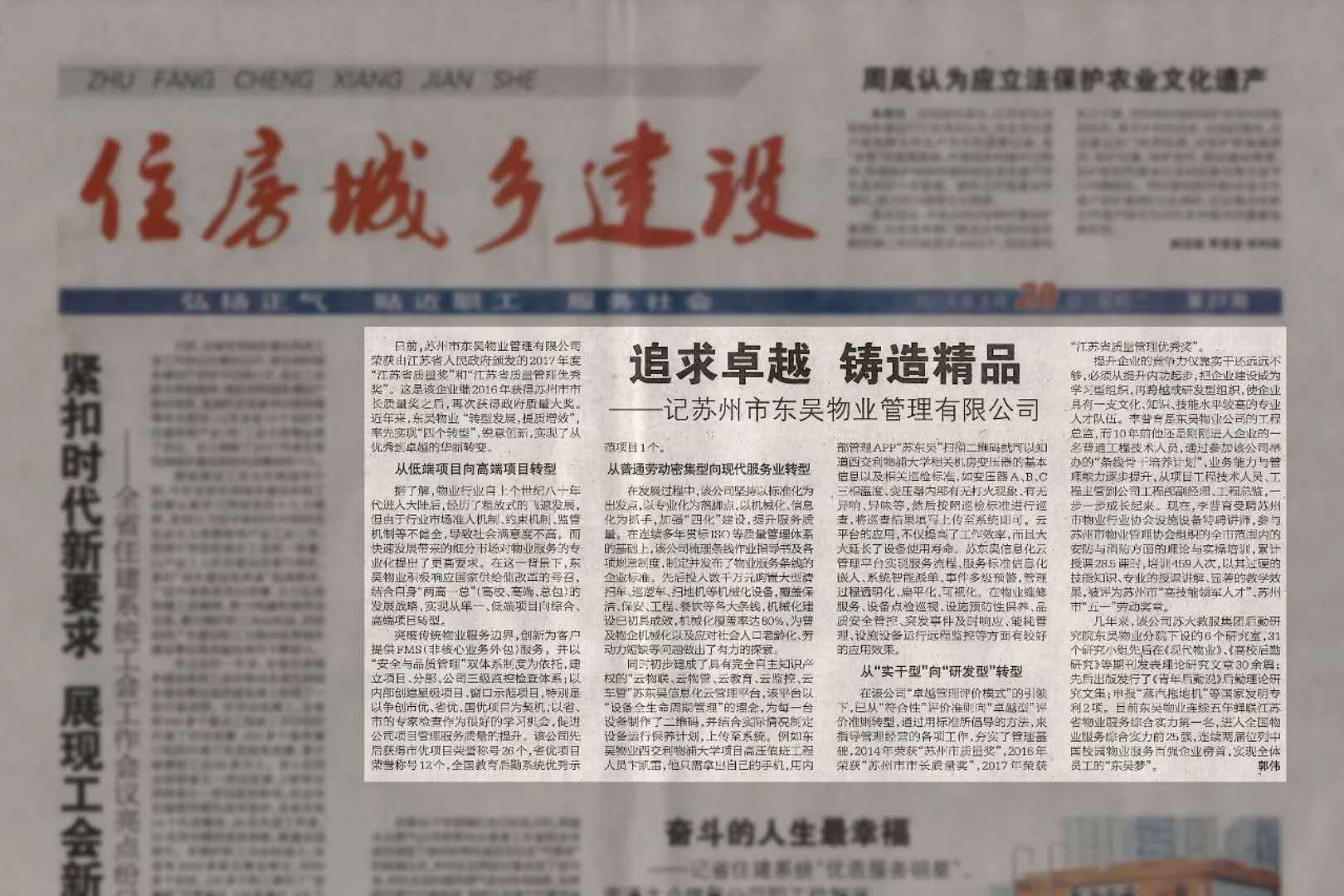 3月20日,《江苏工人报》在其《住房城乡建设》板块刊登了题为《追求卓越 铸造精品》的东吴物业专题报道。