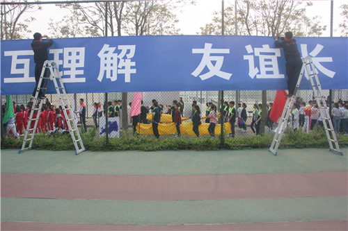工程技术部人员负责拆卸主席台前栏杆,为运动会主席台提供一个广阔的视角;按照学校开幕式看台座区示意图将学院牌悬挂到位;同时还负责做好场地足球门的搬移、旗杆的提前检修、会场电力的供应等项工作。