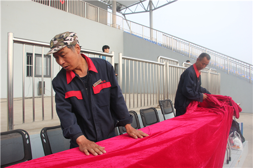 为使主席台和比赛场地有一个整洁美观的环境,物业环境管理部外围保洁人员于17日至18日对看台上千个座椅进行反复冲刷和擦拭,并对主席台地面进行冲洗,对场地进行彻底的卫生清理,确保会场无卫生死角。