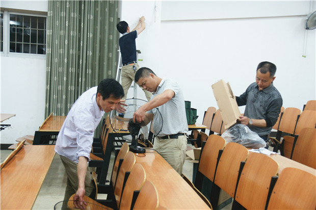 为了不影响同学们的正常上课,维修班的6名维修人员只能利用夜间开展维修工作,每天晚上从7点奋战到深夜12点半,一干就是5个多小时。通过两个晚上的加班加点,他们共维修风扇60多台,更换风扇30多台。
