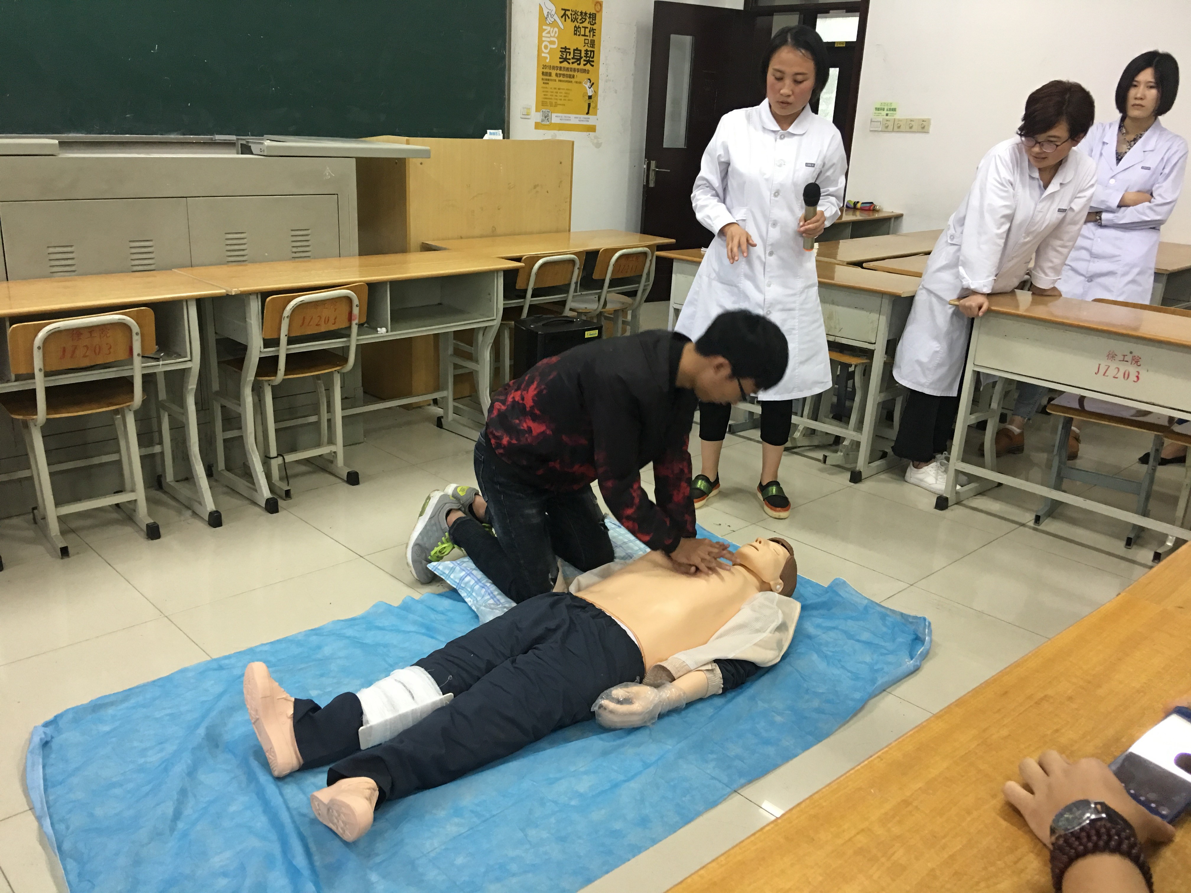 在纪念汶川大地震十周年及第107个国际护士节来临之际,5月11日下午,江苏省红十会应急救护培训师、校医院护士孙艳秋同志带领校医院医务工作人员走进数理学院,为数理学院师生进行了一场应急救护专业知识讲座。本次活动旨在弘扬红十字专业救护知识,提高师生应对突发灾难时应急救护能力,普及科学专业的救护概念。讲座内容包括海姆立克急救法、心肺复苏术、急救的概念等。
