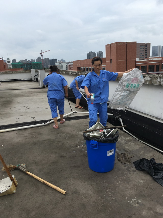 暑假期间,学校短学期及各类考试、培训达七次,教学楼保洁工作就成了常态化工作。楼道清洁、教室保洁照常进行,道路清扫、水域清洁等工作有序开展。保洁人员还集中精力完成了问鼎水系的清洗、万人球场的清扫、教学区化粪池清理等工作。另外,今年学校“五水共治”工程贯穿整个暑期,给室外保洁工作带来了很大的难度,但保洁人员仍迎难而上,始终保证校园的干净整洁。