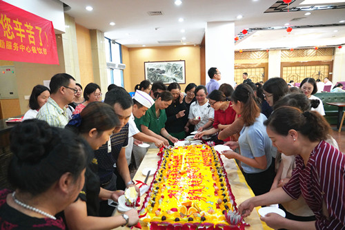 随后,后勤服务中心副总经理、餐饮部部长刘俭带领餐饮部员工给前来就餐的教职工分发了蛋糕,表达后勤人对所有教职工的敬意与感激。