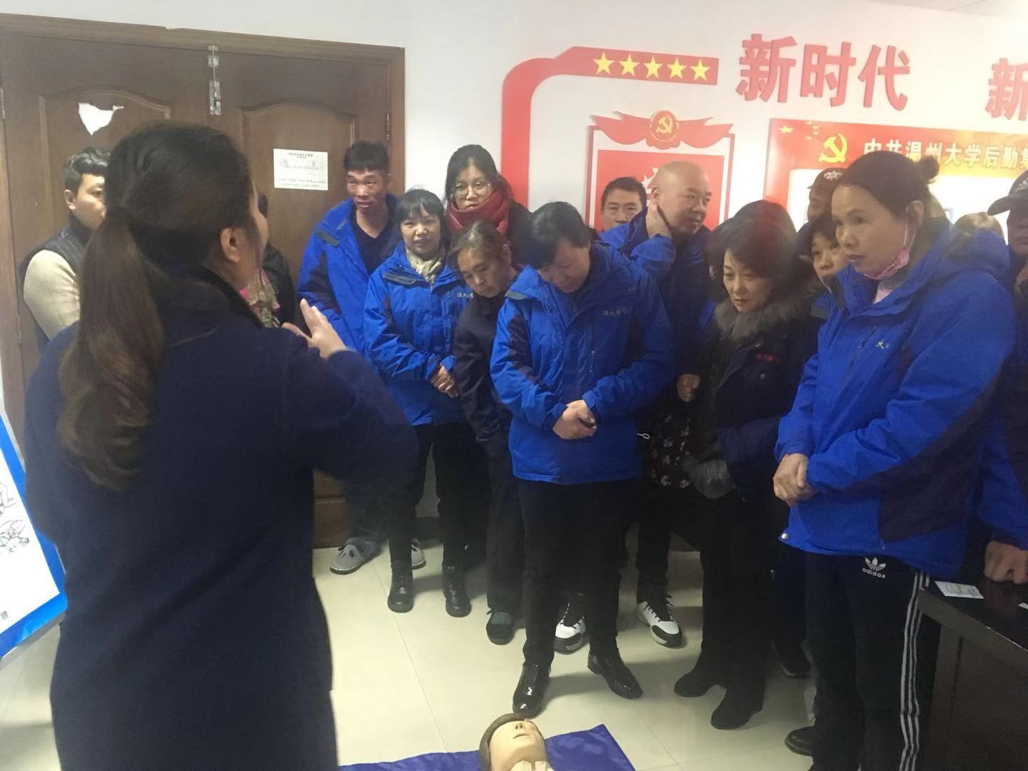 为进一步提高宿舍管理员的安全救护能力,宿管服务公司特邀医疗保健中心林杭医生为宿管员工进行心肺复苏培训,于12月12日、13日分二批在后勤第一会议室举行,宿管全员100多人参加了此次培训。
