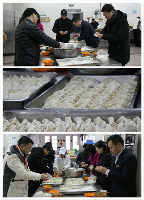 后勤管理处饮食中心提前半个月就对除夕午宴进行了精心准备,并在微后勤公众号开展了“我的年午饭,菜单我来选”的活动。2月3日上午,副校长田备与后勤保障系统党委书记卢长征、后勤管理处处长方正泉特意来到江南苑后厨房与餐厅员工一起包饺子,共贺新年。