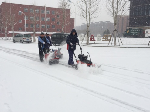 2019年2月14日,北京地区迎来新年的第一场雪,此时恰逢同学陆续返校,为保证校园内道路畅通,校区管理办公室启动扫雪应急预案,采取责任到人、分组、分区域加班加点的方式进行清扫,参加人员约500人次,机械设备18台次。在教师和同学来到学校前,校园主干道及楼宇、园区周边道路的积雪基本清理完毕。后勤人员的辛勤工作恰如初春的阳光,融化了校园的冰雪,也温暖了每个人的心。2019年的新学期即在这样干净安全的校园里拉开帷幕。