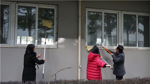 而在一边的E区研究生自习室里,温大后勤总支第三党支部全体党员及宿管会干事正在如火如荼地擦玻璃。望着一块块挂满灰尘和污渍的玻璃,同志们鼓足干劲,用心擦掉每一丝灰尘,无私地贡献自己的力量。天气虽冷,但心是暖的,只有拥有一颗温暖的赤诚之心,才能成就大爱。污渍虽顽固,但通过大家的努力,一块块玻璃渐渐显示出了它原有的光亮。明亮的玻璃使得这次活动的意义进一步升华.
