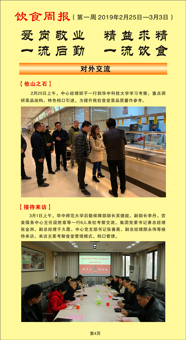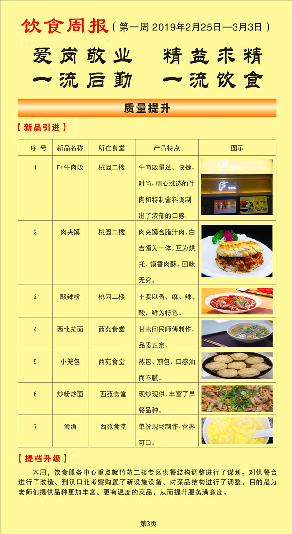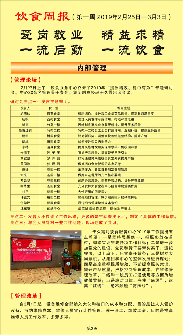 近日,饮食服务中心推出《饮食周报》,将中心每周发生的重要事情和创新举措编辑成册,以电子版呈现,并下发给中心全体职工。现将第一期《饮食周报》分享如下: