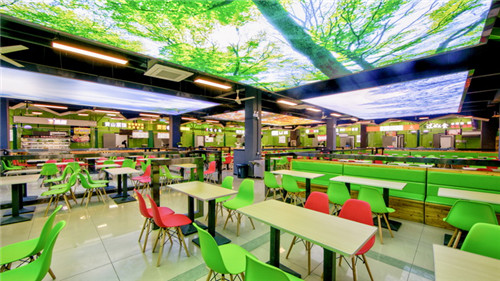 历时近2个多月,一个具有浙农林大特色的“生态餐厅”完美呈现:餐厅以绿色为设计主色调,采用环保LED灯,并配套取景四季的灯膜,与学校生态环保绿色的理念有机结合;整体面积达到2800多平方米,能同时容纳800人就餐,氛围清新脱俗、优雅闲适,让师生仿佛有置身于郁郁葱葱的森林之中享受美食的怡人体验。
