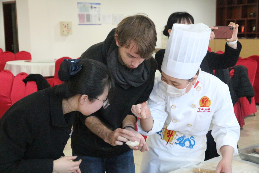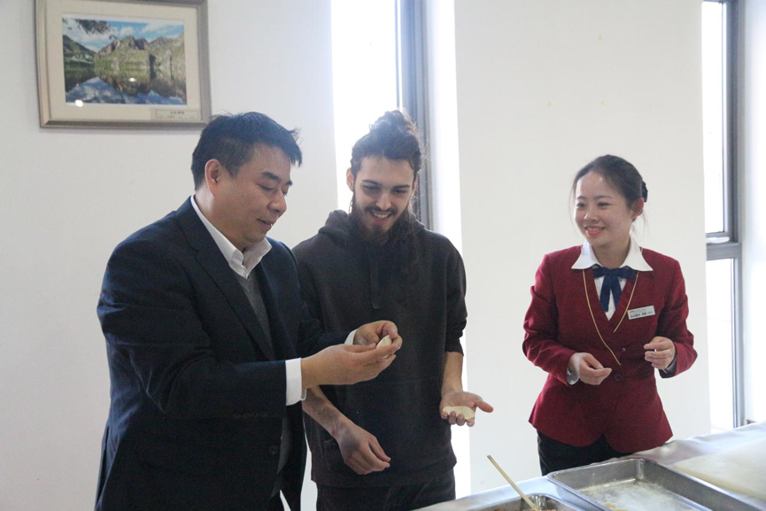 实践是巩固学习效果的最佳办法,讲解过后就是动手实践环节,留学生们与会议中心员工结成小组,由会议中心员工指导协助留学生们动手实践包饺子,留学生们学会了包饺子的技巧,会议中心的员工也借此锻炼了英语口语。