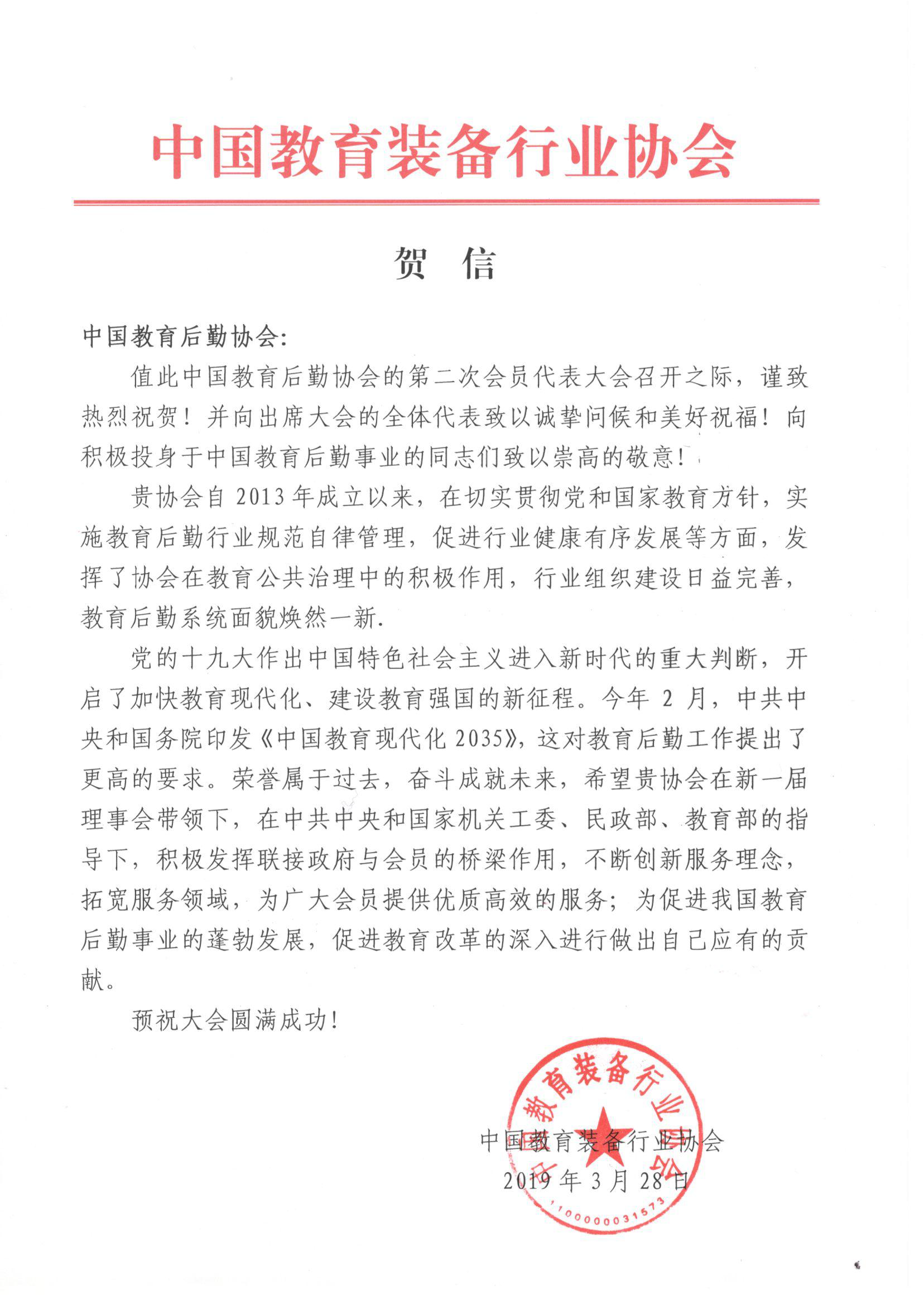 中国教育装备行业协会致中国教育后勤协会的贺信