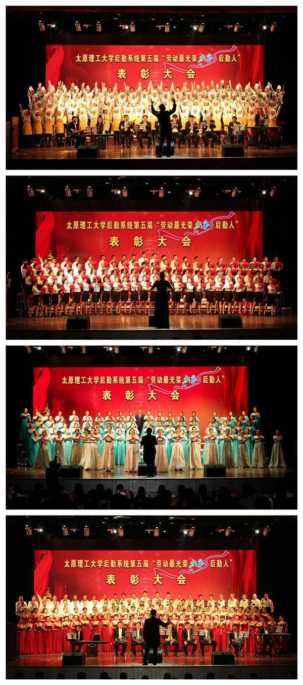 表彰大会上,微视频《我们都是追梦人》展现了后勤人无私奉献、追求卓越、在改革的道路上努力奔跑奋进的的精神风貌和时代风采。由后勤系统各部门职工组成的四支合唱队演唱了《劳动托起中国梦》、《我们走在大路上》、《今天是你的生日》、《在灿烂的阳光下》等歌曲。气势雄壮的旋律,铿锵有力的节奏,激昂高亢的歌声,唱出了后勤职工对祖国的热爱与深情,唱出了后勤职工为学校“双一流”建设再立新功、再创辉煌的豪迈与激情。