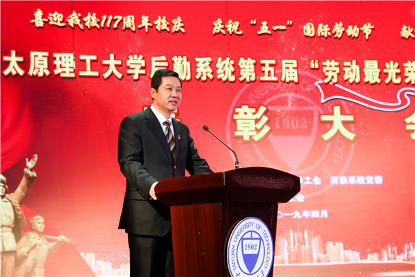 吴玉程发表重要讲话,他指出,太原理工大学后勤职工辛勤劳动、默默奉献,争当一流,走在了全省高校后勤工作的前列,为学校学科建设、人才引用、教学科研、学生工作、师生生活提供了坚实有力的后勤保障服务,是学校发展建设的幕后英雄,是理工建设最可爱的人,我为后勤战线上的全体后勤职工们点赞。他强调,今年是新中国成立70周年,也是我校“双一流”建设奋力冲刺的关键一年,全体后勤职工要大力弘扬劳模精神,发扬工匠精神,厚植奋斗理念,展现劳动情怀,改革创新、奋发有为、勠力同心,追梦奋斗,用辛勤和智慧打造一流的后勤服务保障,助力学校实现建设中国特色“双一流”大学的宏伟梦想。