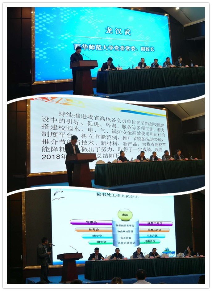 会上,西华师范大学党委常委、副校长龙汉武致辞,动力与节能专业委员会主任、西南交通大学后勤与基建管理处处长宋新就动专会2018年工作报告及2019年工作计划做专题报告,四川师范大学后勤集团副总经理范明东,通报动专会2018年度财务收支情况,理事会常务副主任、西南交通大学后勤与基建管理处副处长高磊,通报了四川省高校后勤协会新片区划分学校名单和动专会片区组长单位名单,西华大学后勤服务总公司副总经理唐睿,通报了理事会成员信息变更事宜,川北医学院后勤管理处副处长李卫星,通报了四川省高校后勤协会2017—2018年度动力与节能工作先进集体、先进个人名单。四川省高校后勤协会秘书长高庆致辞,并对动力与节能专业委员会2018年的工作及2019年的工作计划进行了补充和说明,通报了高校后勤协会2019年的工作计划等。
