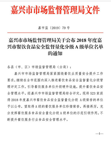 近日,嘉兴市市场监督管理局发布通知,经过严格评审,我校越秀校区第一食堂、越秀校区春华苑自选餐厅、梁林校区第一食堂二楼餐厅、梁林校区第二食堂被评定为“2018年度全市餐饮食品安全监督量化分级A级单位”,其中外包租赁单位梁林校区第一食堂一楼餐厅更是首次顺利通过A级评定。